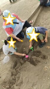 遊具で体を動かしたり、砂場で穴を掘って水を流して遊びます。