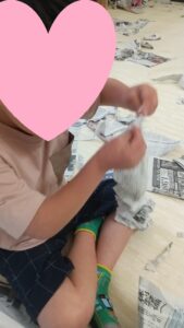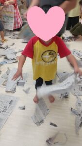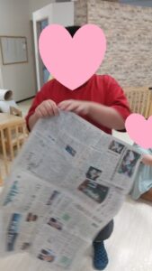 新聞紙遊びは、みんな大好きでやることを伝えると、「おし!」というような表情をしていました。