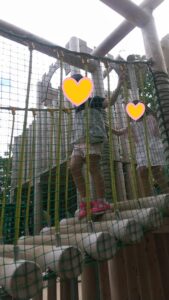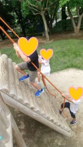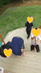 アスレチックの綱がついた橋はグラグラで怖くて1人では渡れなくても、お友達と2人なら渡れたり🤗、ロープで昇る滑り台もみんなでチャレンジすれば登れたり♪。