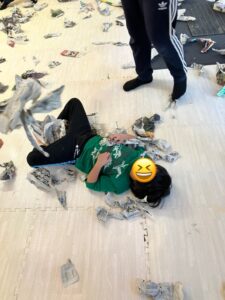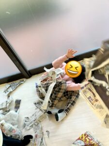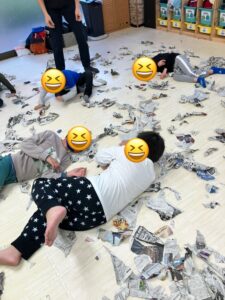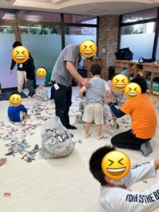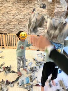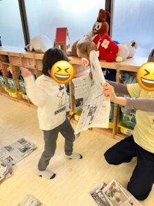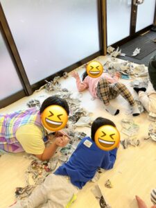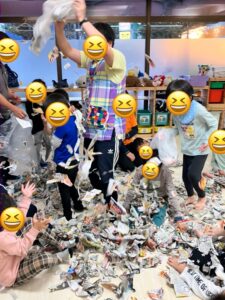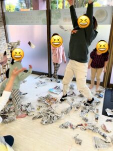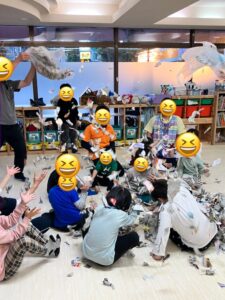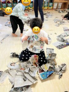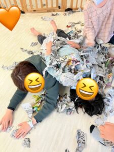 最後は、みんなで新聞紙を集めて、新聞紙シャワーです♪