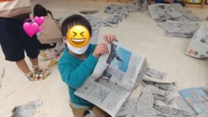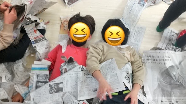 たくさん体を動かした後は、新聞紙のお布団でリラックス~♪