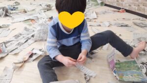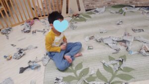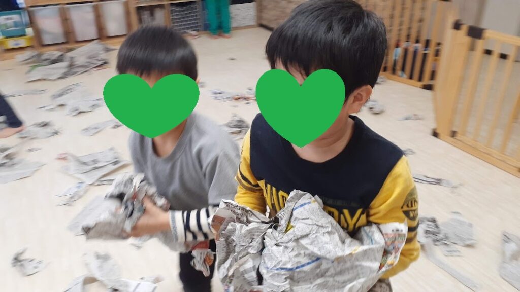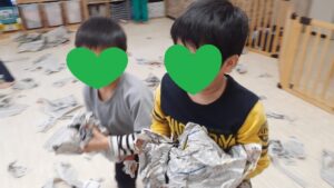 思いっきり破いてみたり、細くちぎってみたり、お友だちやスタッフと投げ合いっこしてみたり普段で出来ない感覚を楽しんでいました(^o^)丿