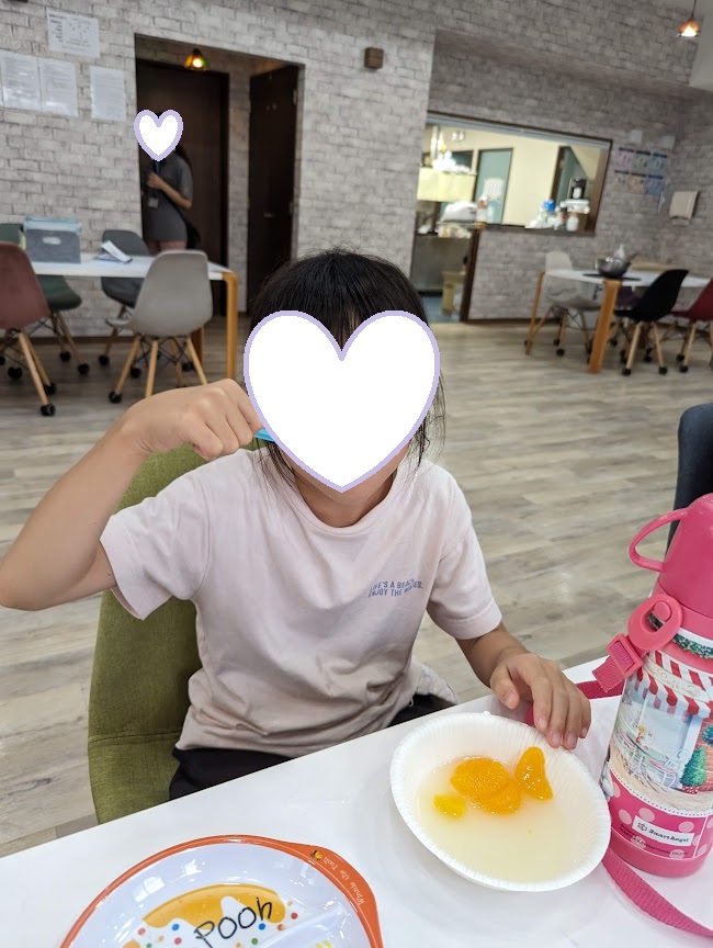まずは、おやつの時間にちょっと特別なデザート「フルーツポンチ」をみんなで食べ、