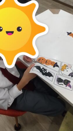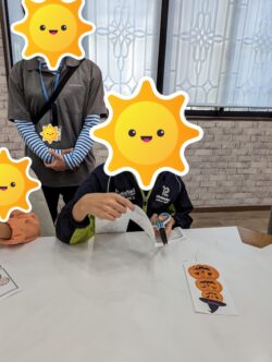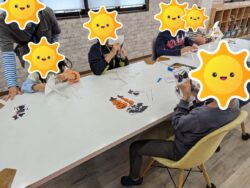 今日はハロウィン飾りをハサミで切り抜いてもらいました。