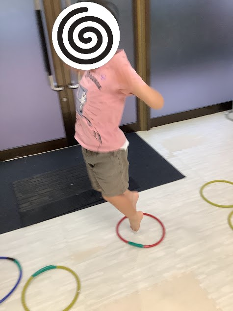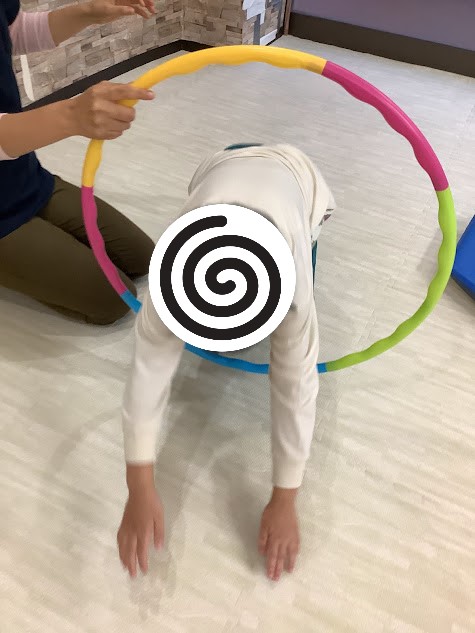最後はフラフープくぐり〇