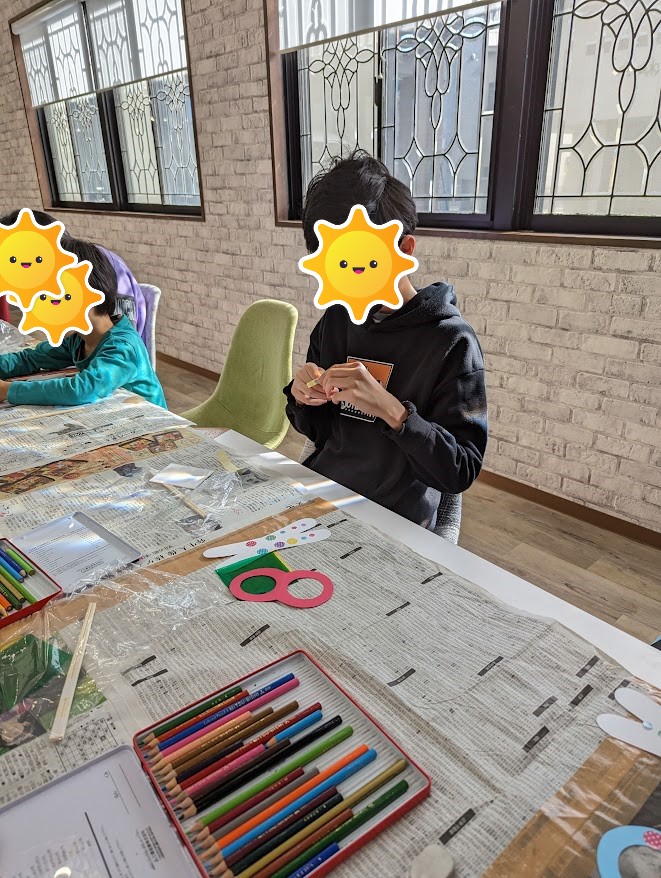 まずは羽と眼鏡の枠にシール貼りやお絵かきをします✐