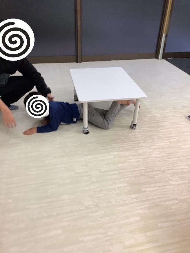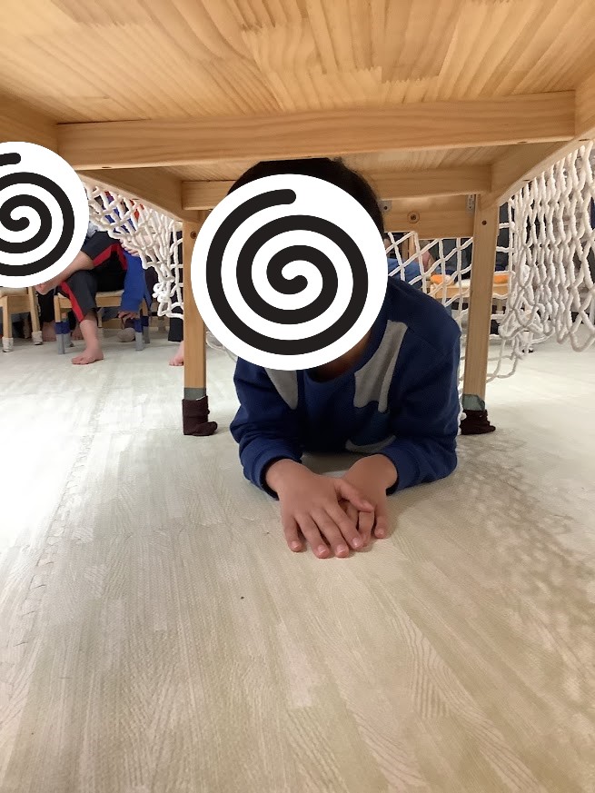 狭い机をくぐって☺