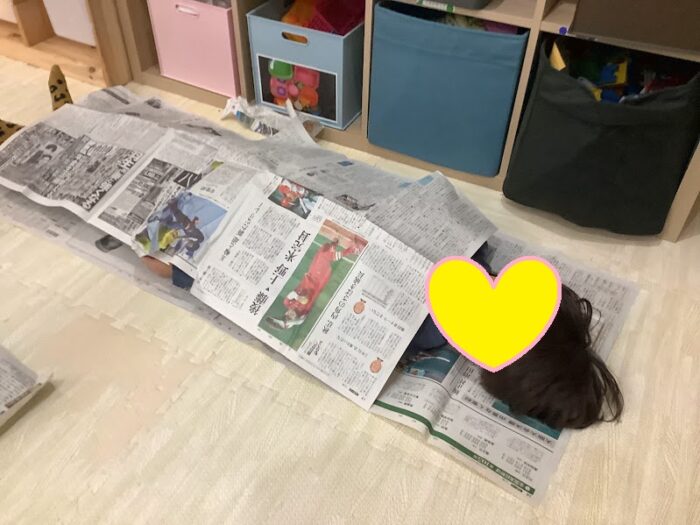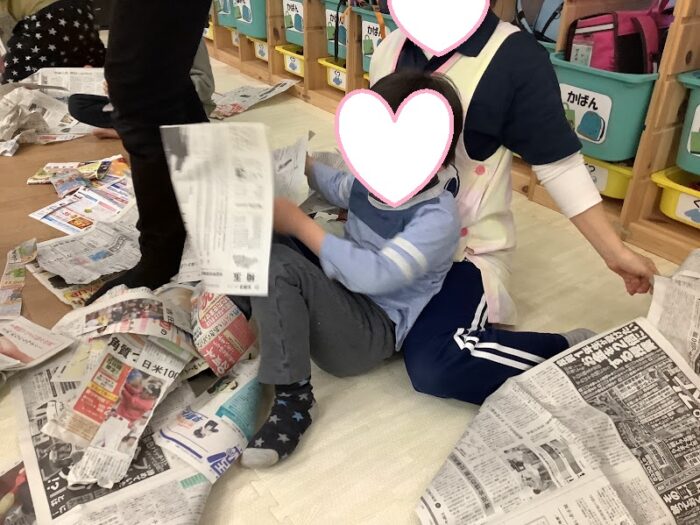 今日は新聞紙を使って、紙遊びを行いました。