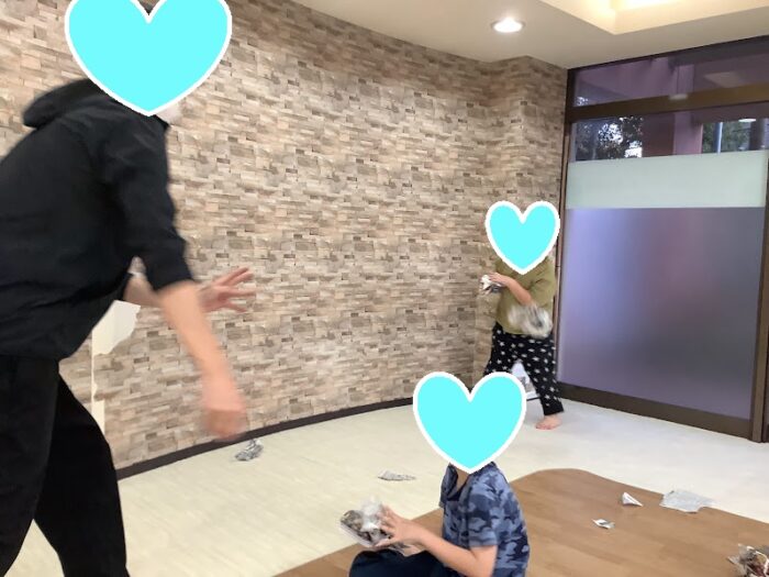 新聞紙を丸めて、みんなで投げ合って楽しみました!