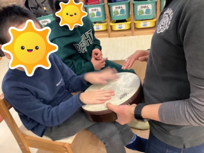 最初に先生とタンバリンを叩いて「こんにちは♪」「よろしくね🥰」と元気よくご挨拶!
