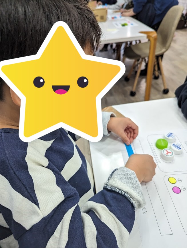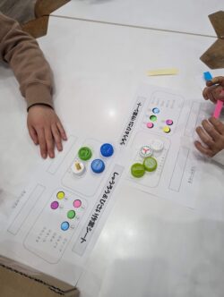 ペットボトルキャップやシールなどを配られたシートに配置していく