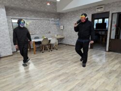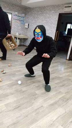 今回は2人の鬼さんが持っている箱に、豆に見立てた玉を投げ込みます😄