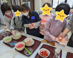 みんなで協力して、ピンクとグリーンの2色のゼリーを作りました。