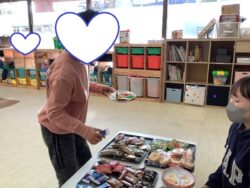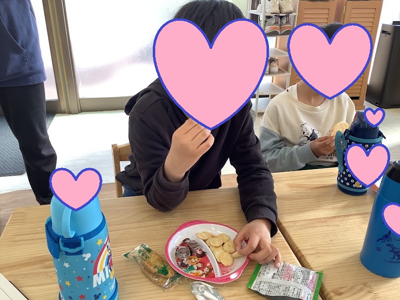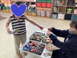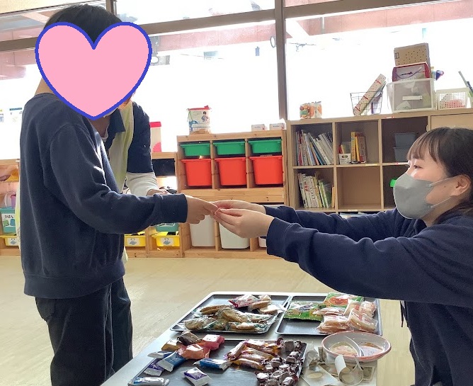 おやつの時間に、好きなお菓子を選んで、1000円払ってお釣りの500円をもらう練習です。