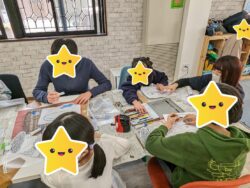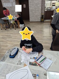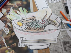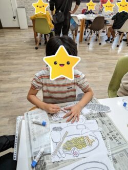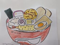 どんぶりの絵の中に自分の好きな具や麺を選んでのりで貼付け、色を塗っていくワークになります😤
