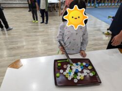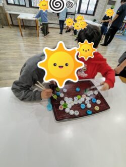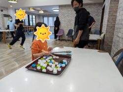 トング、スプーン、お箸を使い大小異なるペットボトルのキャップを机から机に運んでいきます(^^)/