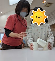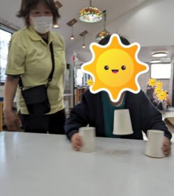 次に3つの紙コップを使ってダルマ落としの容量で上のコップを倒さないように下に置いてある2つのコップを一気に引くゲームを開始!!
