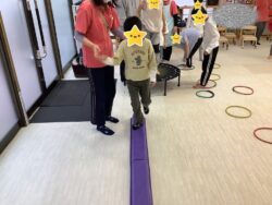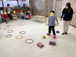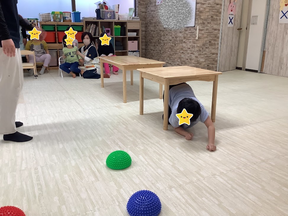 机の下をくぐり、ミニぶーぶクッション、ケンケンパ、