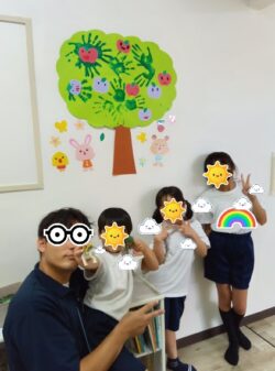 壁面に貼り付ける果物に可愛く顔を描いてもらい、仲良くハイチーズ💕