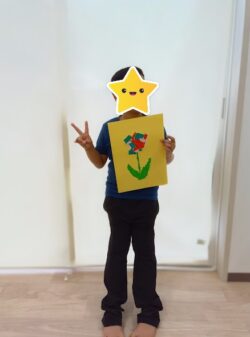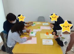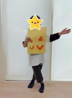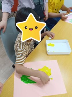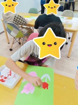 ちぎった折り紙をチューリップの型に貼っていきます。
