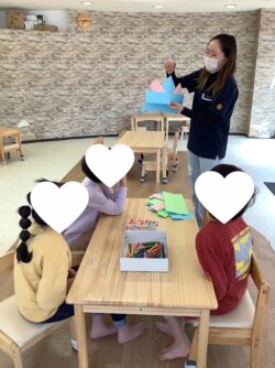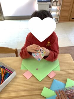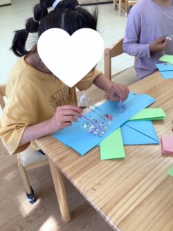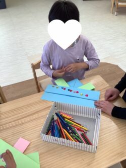 画用紙で作ったかぶとにシールを貼ったり、色鉛筆でお絵かきしたりします✏