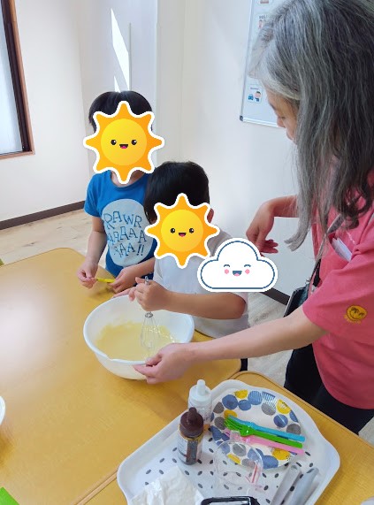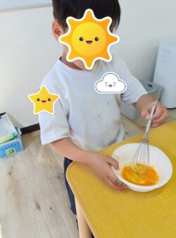 「スタッフさんと一緒に美味しいホットケーキを作るよ!」と、頑張って混ぜてくれています🌟