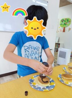 自分の好きなトッピングをして、「自分で作ったホットケーキは美味しい😊」と、美味しそうに食べられていました😊