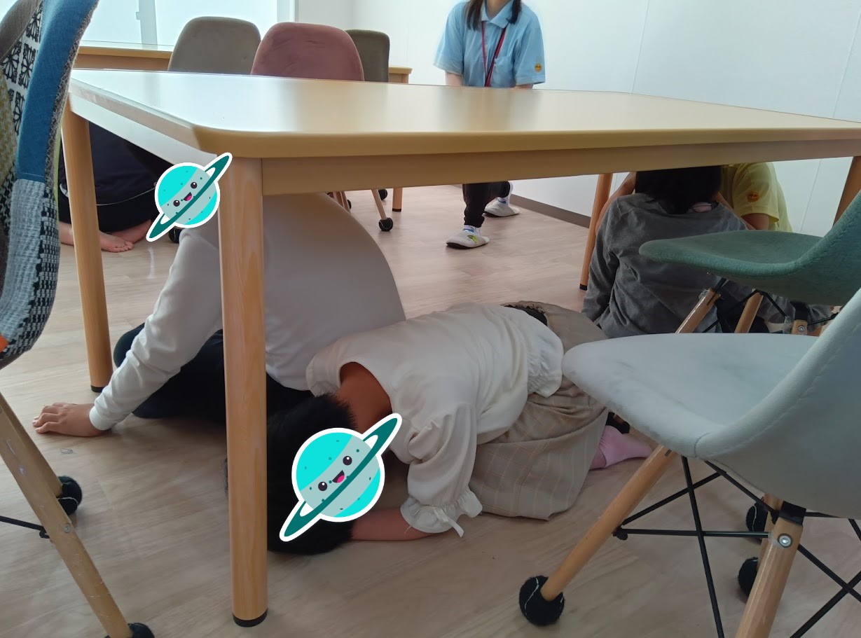 みんな素早く机の下にもぐります。