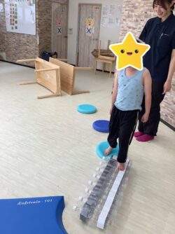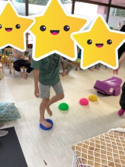 そしてまたまた、不安定ゾーン!!このボツボツしたボールのようなものは、足の裏を刺激してくれるので、足裏の感覚神経への働きを促してくれます。足裏から、地面の情報をキャッチする感覚に磨きをかけると、バランス感覚の向上等にも繋がりますね!