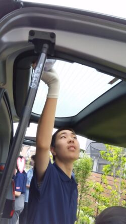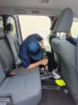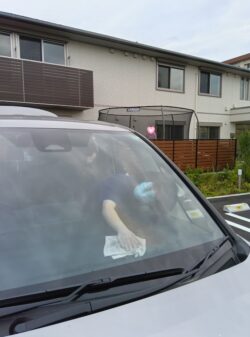 身体を動かす準備万全!先ずは送迎で使う車の車内清掃です。皆さんが気持ち良く使える様に綺麗にします。