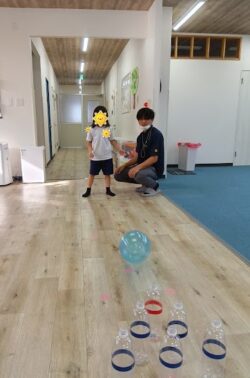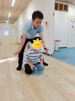 まずはボールを両手でしっかり持ってピンに向かって転がすことを目標に取り組みました。