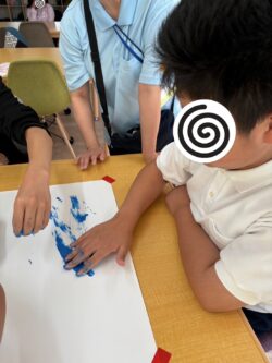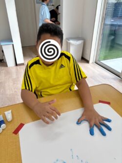 フィンガーペイントは、手や指に直接絵具をつけて絵を描きます。