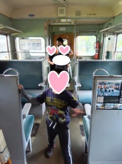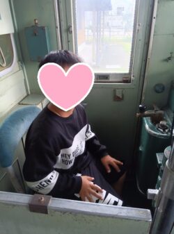 車掌さんの制服と帽子をかぶり、はい、ポーズ😊