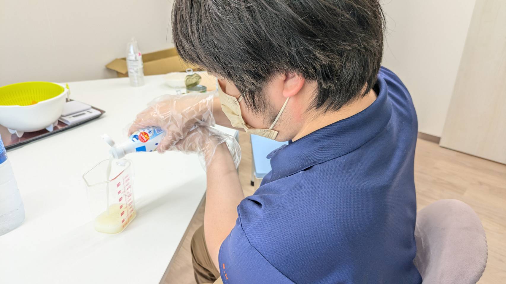 スタッフの話を聞いて、ゼリーに必要な材料を混ぜて作りました。