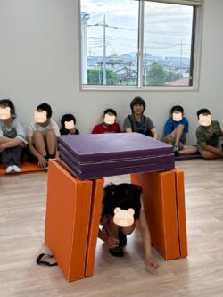 ①…クッションでトンネルを作り、目で見たものとの距離を意識しぶつからないように進みます。