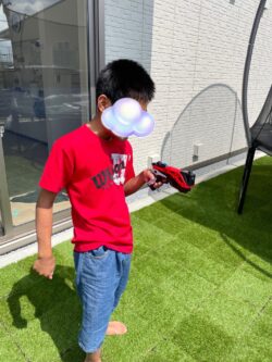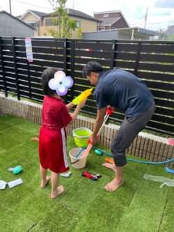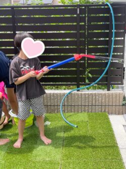 まはろ桜のお庭を使って、水鉄砲を使って遊びました。