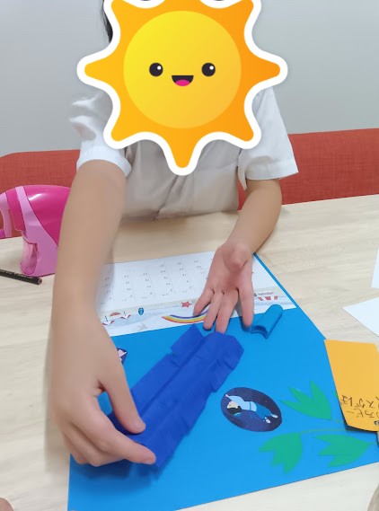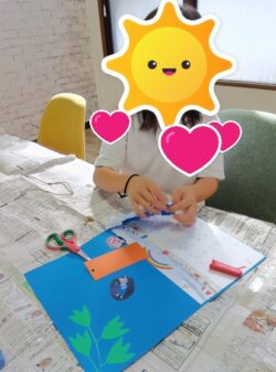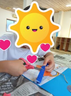 はさみを使って折り紙を切り、天の川を作成中😊