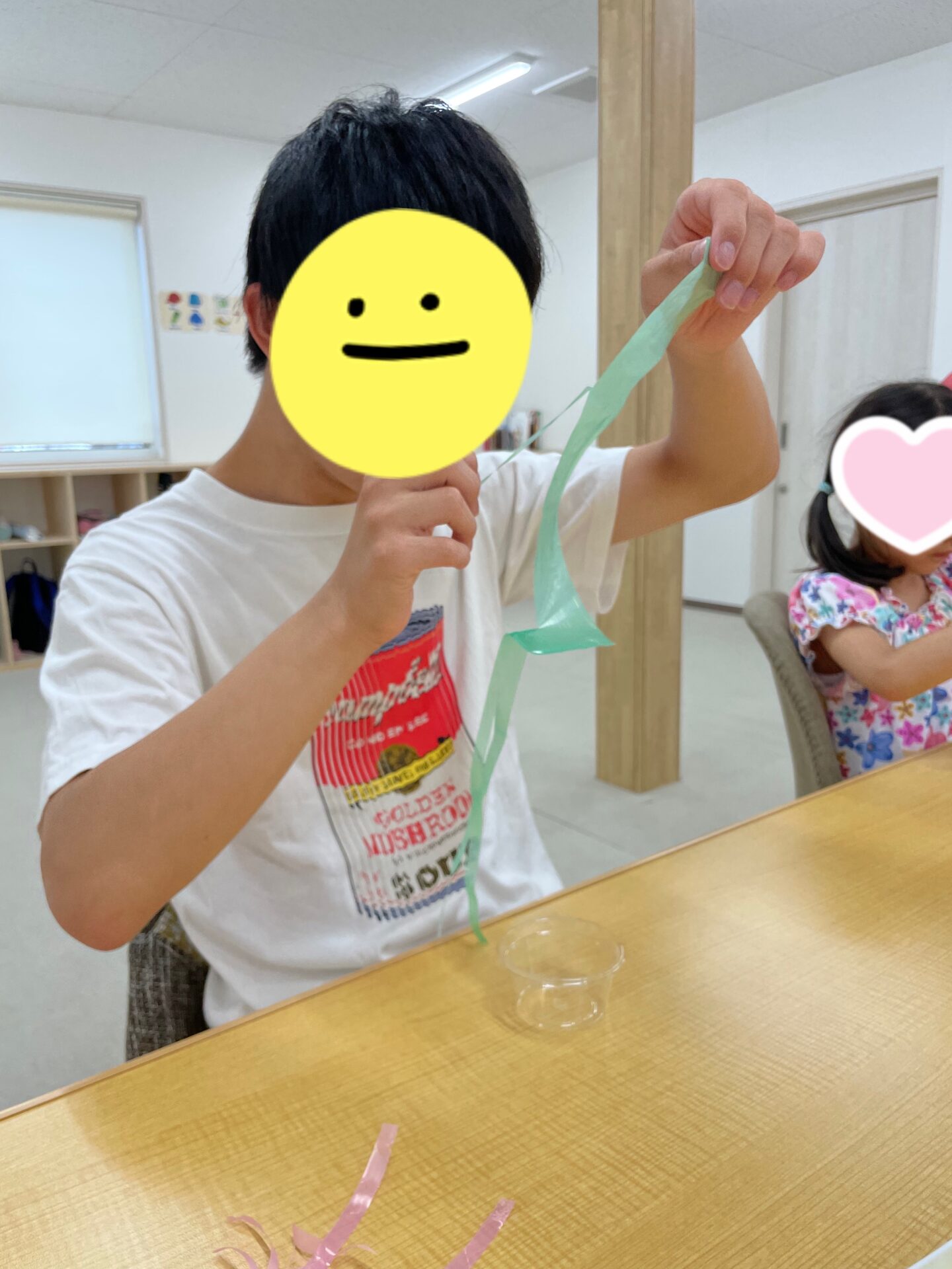 透明のカップにスズランテープをつけて