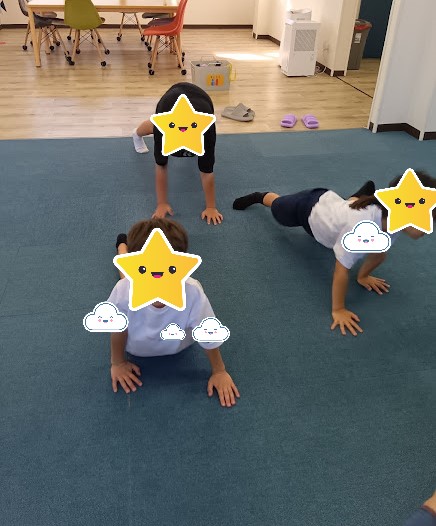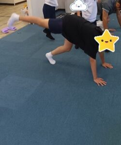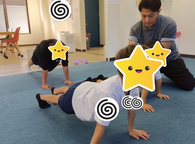 腕立て姿勢を30秒間維持です!。腹筋に力を入れて、崩れないように頑張って!