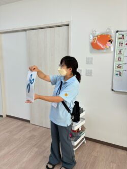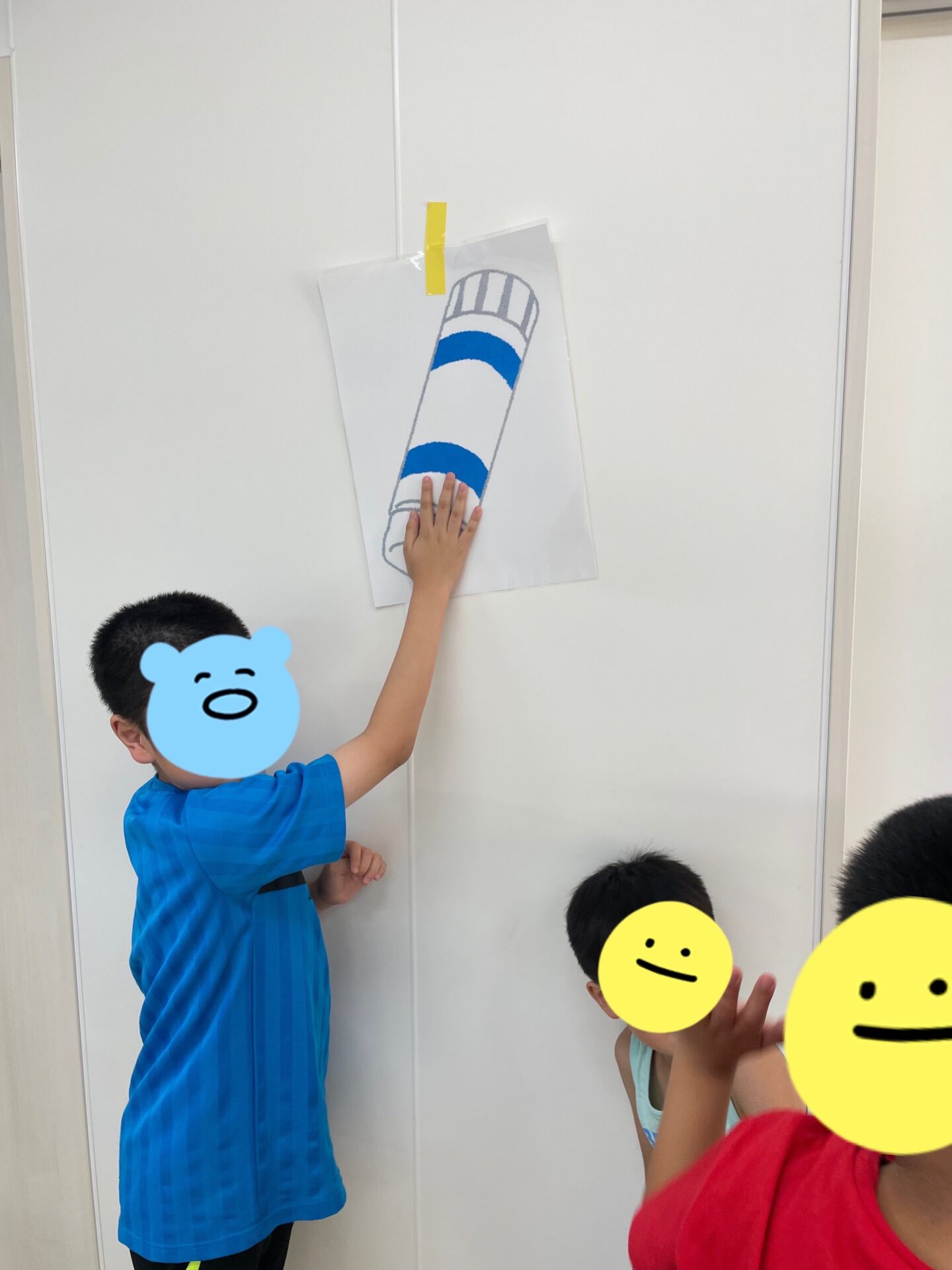 壁に貼られた文房具を聞き取ってタッチするゲームなど、