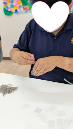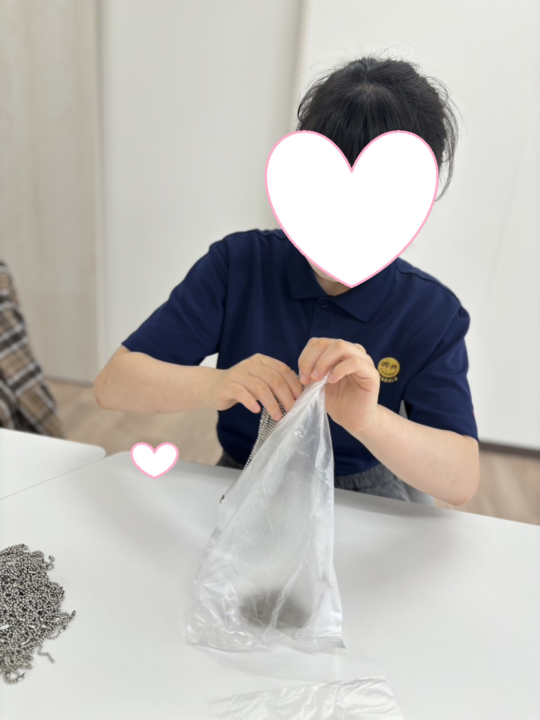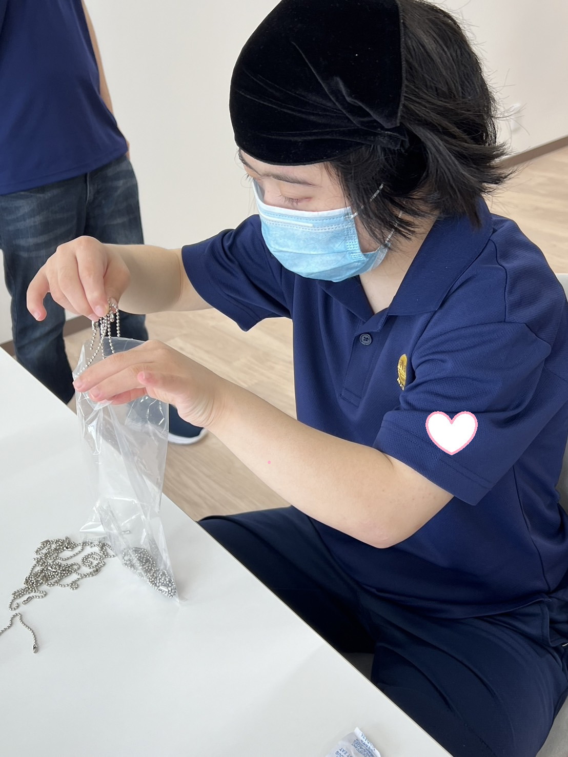 「ボールチェーン」を小さな袋に入れてテープで留める作業です。