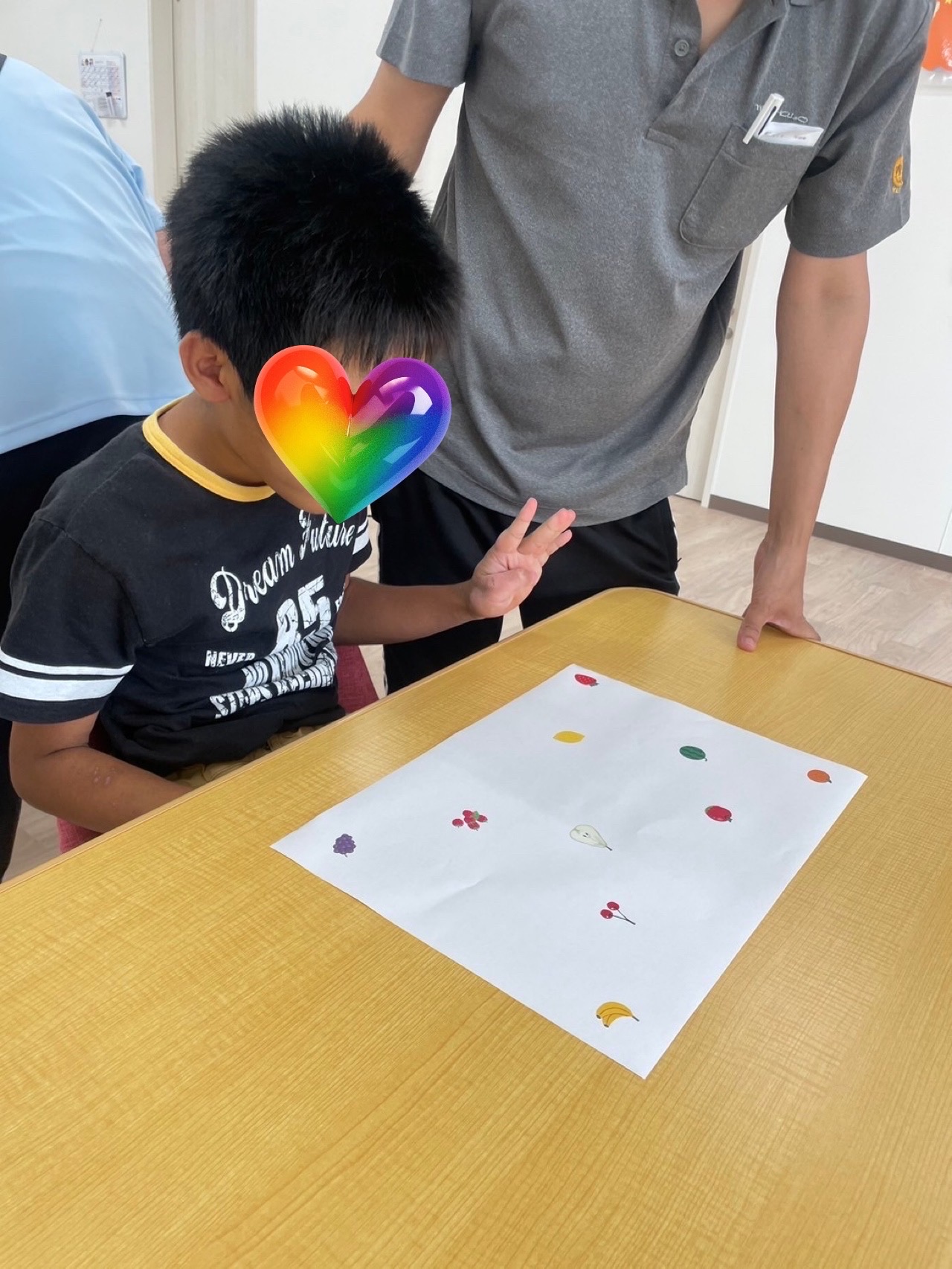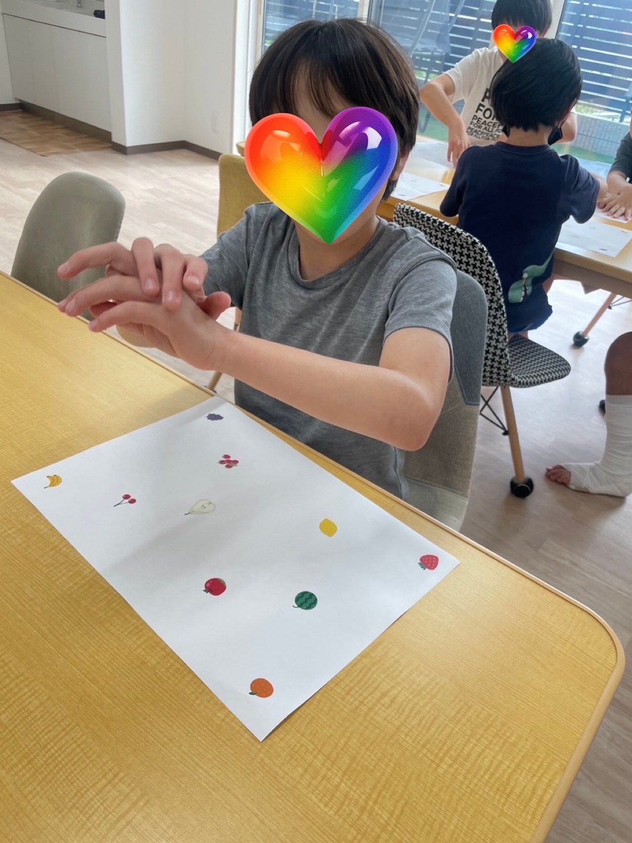 最後は、果物が書かれた定規に洗濯ばさみをつけるトレーニングです(*^^*)