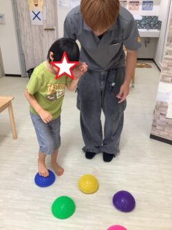 ペットボトルの上を音や感覚を楽しみながら歩きます👣