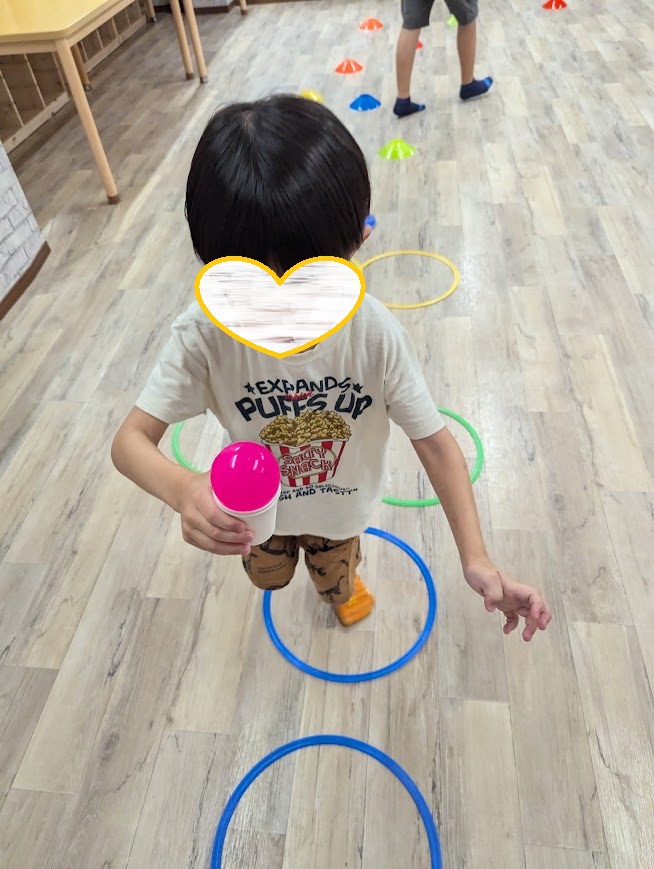 紙コップの中にボールを入れて、いろいろな障害物の中をリレーします。