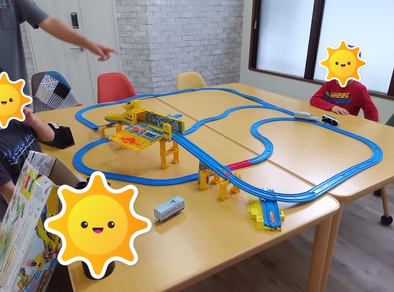 室内遊びでは、プラレールで大作ができました!