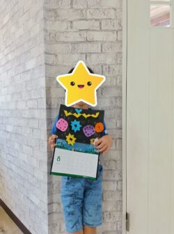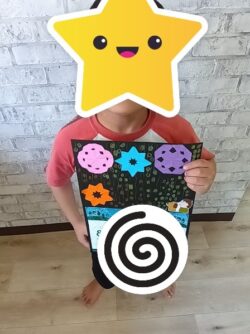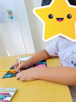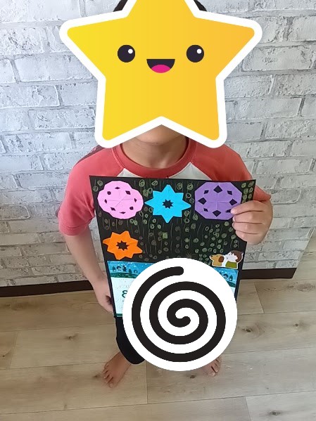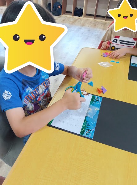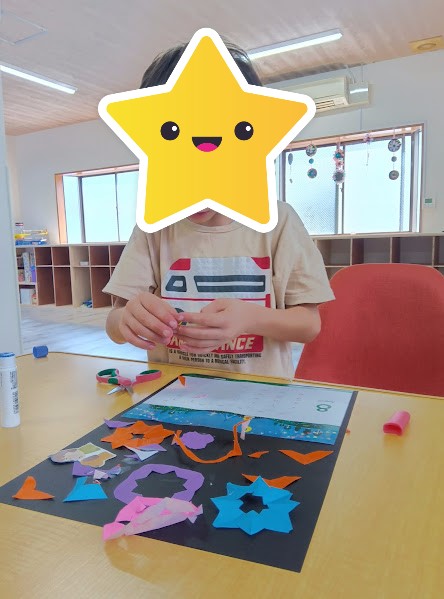 内容は、折り紙で作った花火の切り絵を貼って、色鉛筆で星やお月様など思い思いに作りました。