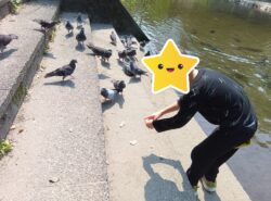 近寄ってくるハトにちょっと怯えながら、エサをあげていました😅