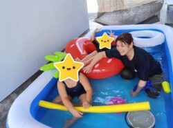 朝、こどもたちを迎えに行くと、「今日はプールだね!」と、