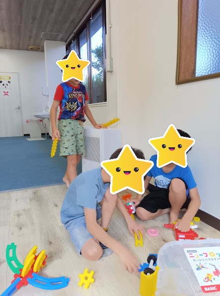 室内あそびでは、ブロックで武器を作成して、みんなで戦いごっこをしました。
