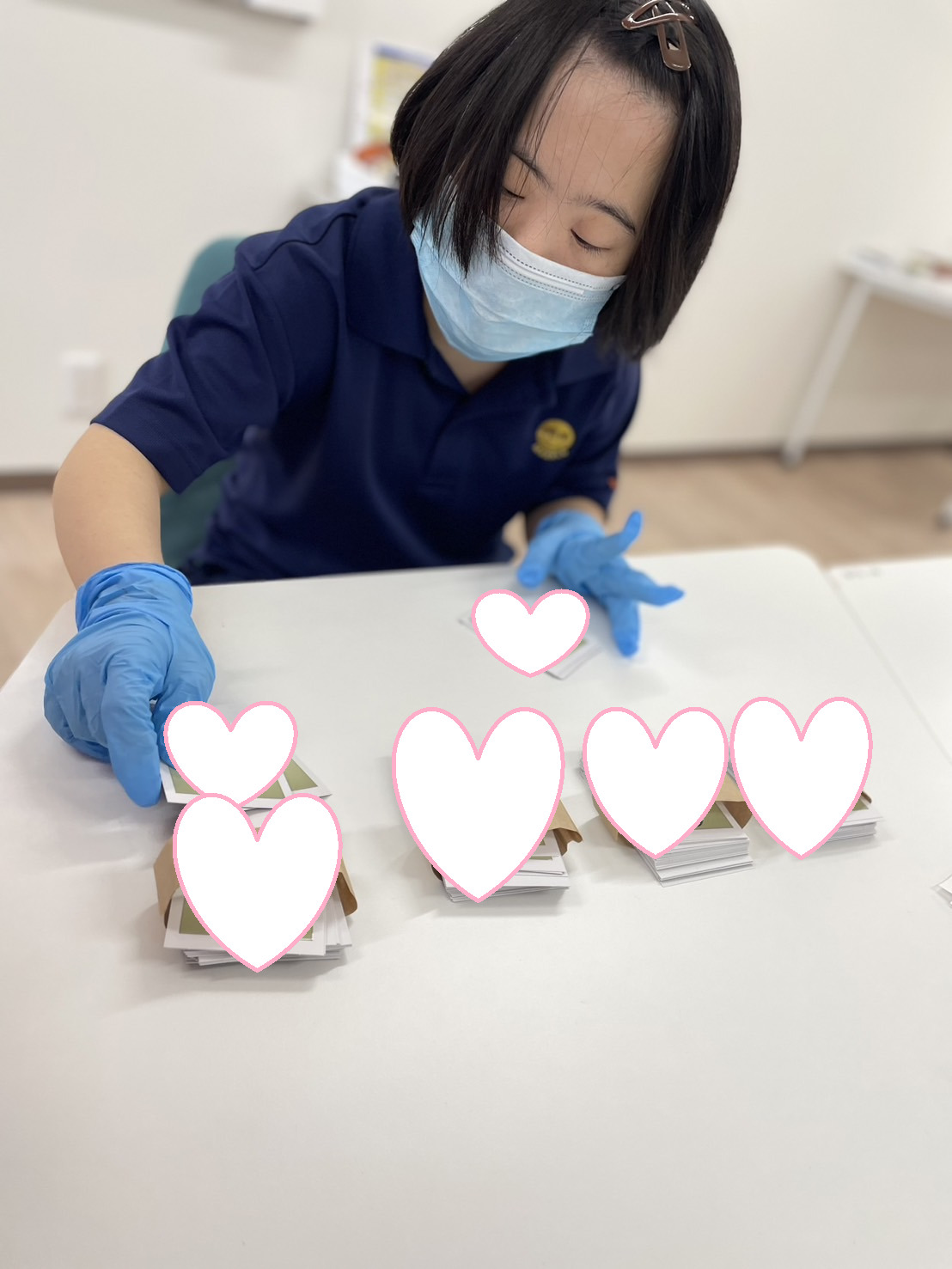 カードを8枚重ねて、袋に詰める作業を分担します。